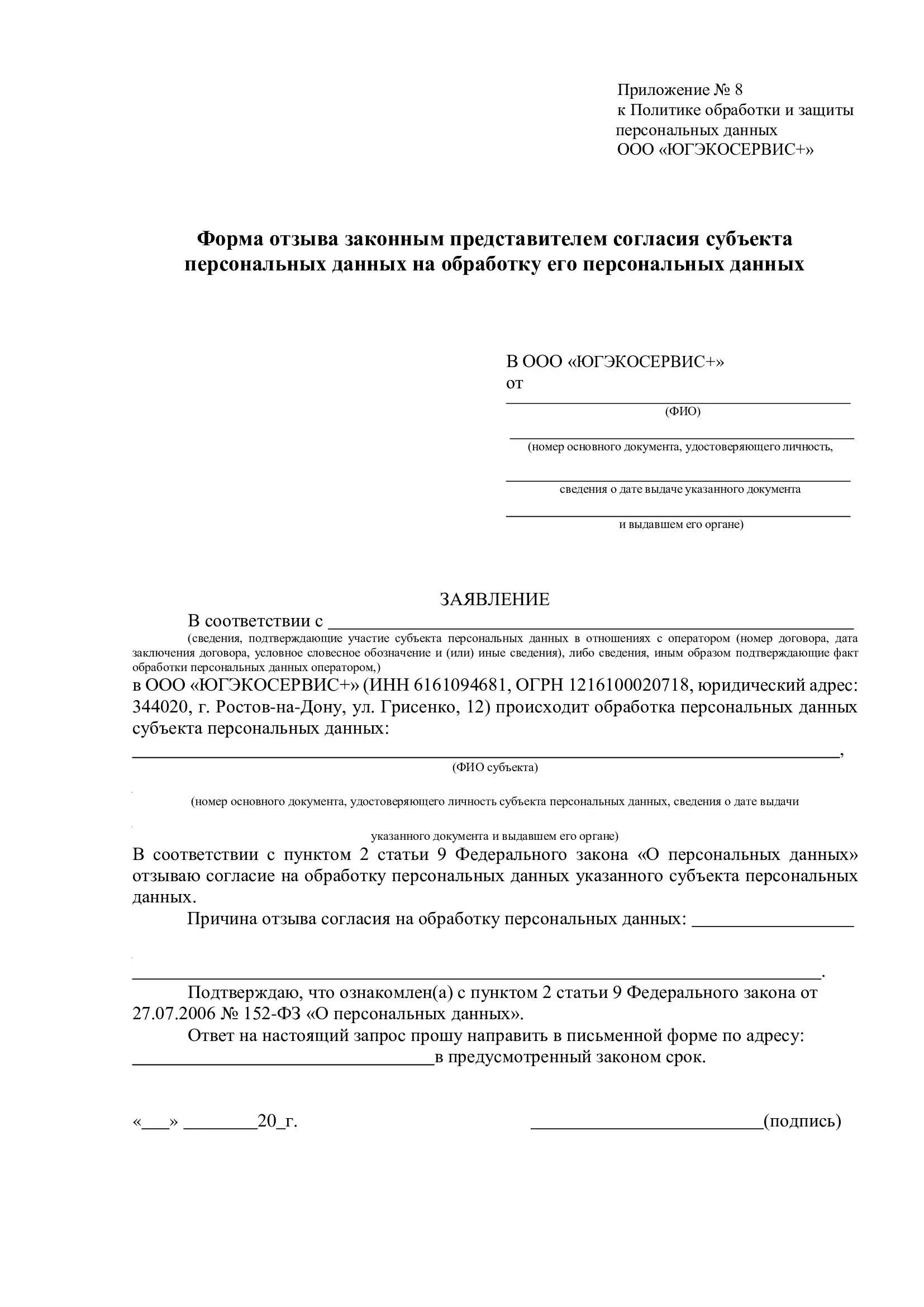 6.11. Для отзыва согласия Субъекта персональных данных на обработку его персональных данных субъекту (либо законному представителю) необходимо заполнить соответствующую форму отзыва согласия субъекта персональных данных на обработку его персональных данных (приложение 4 или 8) и передать лично работникам ООО «ЮГЭКОСЕРВИС+», принимающим обращения граждан, либо по почте. В случае отзыва согласия на обработку персональных данных ООО «ЮГЭКОСЕРВИС+» вправе продолжить обработку персональных данных без согласия субъекта персональных данных при наличии оснований, указанных в пунктах 2 - 11 части 1 статьи 6, части 2 статьи 10 и части 2 статьи 11 Федерального закона от 27.07.2006 № 152-ФЗ «О персональных данных».